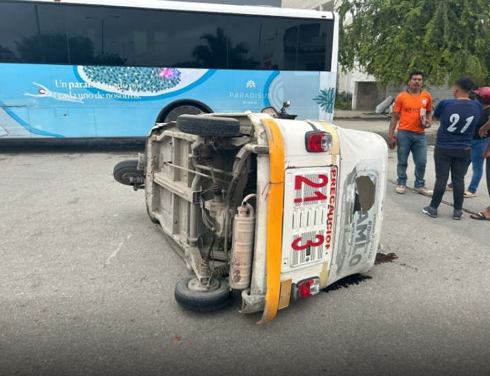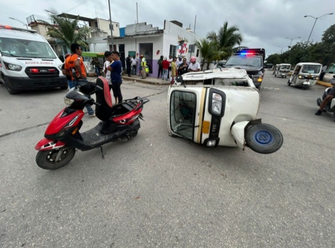 Con heridas leves resulto un motociclista al ser colisionado por el chofer de un mototaxi en el cruce de calle Pavo Real con Cigüeñas, en el fraccionamiento de Villas del Sol, de Cancún. testigos Relataron que el mototaxista con la unidad 213 no respetó su alto correspondiente al llegar al cruce de las vialidades, cuando se trasladaba con dirección al norte, lo que provocó que impactara al conductor de una motocicleta color negra con rojo. El conductor del mototaxi salió ileso, pero su unidad quedó volcada en medio de la vía. Al lugar de los hechos acudieron paramédicos, quienes valoraron al motociclista que no requirió ser trasladado al hospital.